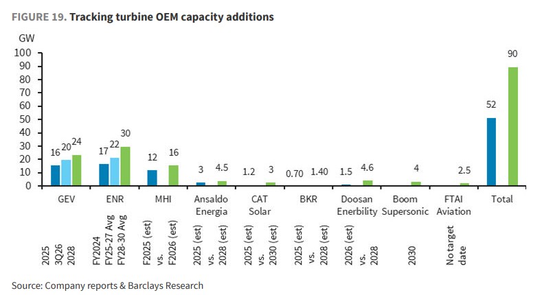 從巴克萊梳理的情況來看,無論是三菱重工、GE Vernova,還是西門子能源,當前的擴產更多來自工藝優化、舊型號復產以及加班生產,而真正依賴新增資本開支的產能,大多要到 2027—2028 年之後才能逐步體現。