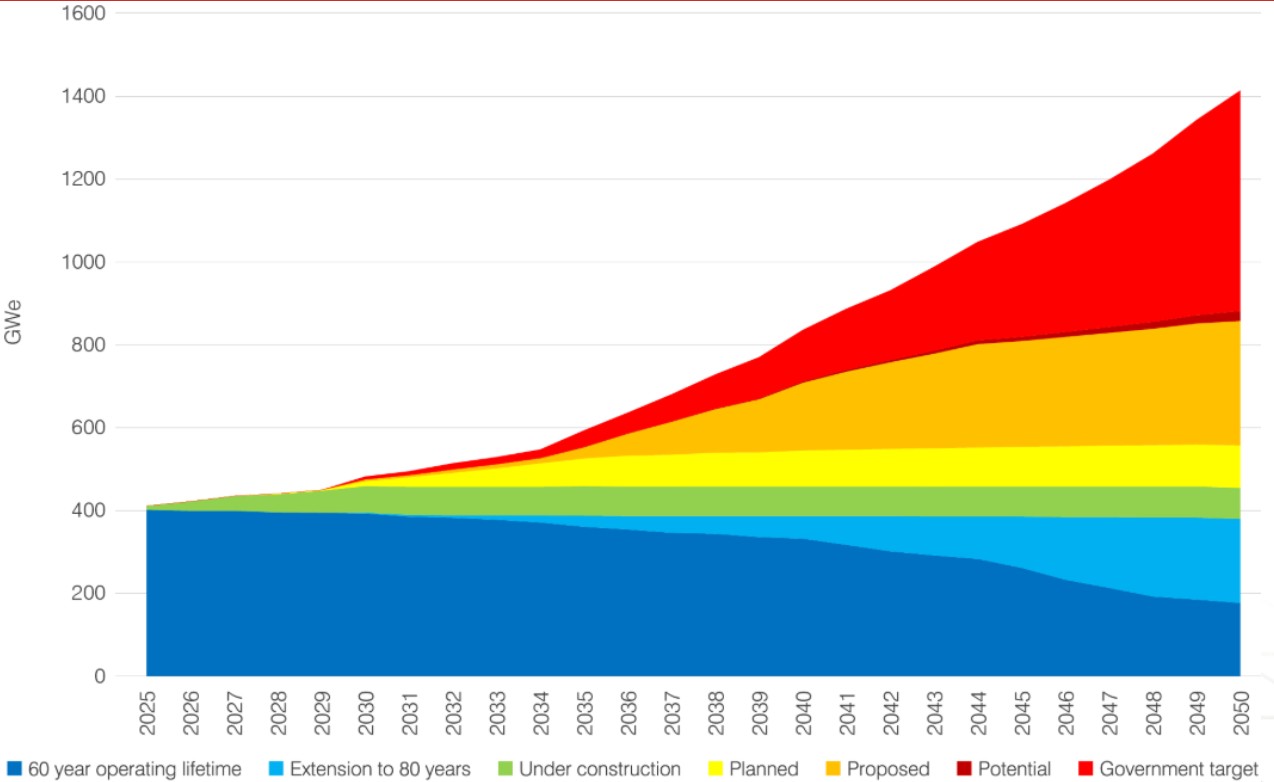 四代核電通過 “負温度係數”“非能動冷卻”“多重包容” 等設計,實現在事故下僅依靠自然物理規律即可趨向安全狀態,從根本上回應了福島、切爾諾貝利等歷史事故引發的公眾焦慮。國際原子能機構(IAEA)連續 5 年上調核電裝機預期,2025 年《世界核展望報告》預測 2050 年全球核電裝機可達 1428GW,較 2023 年 “三倍核能宣言” 的 1200GW 進一步提升。