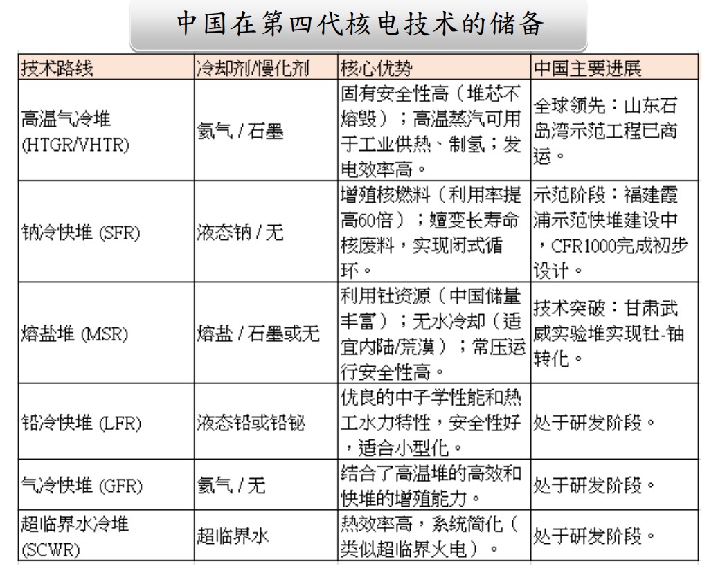 中國在全球四代核電商業化進程中處於領先地位:2023 年投運全球首座四代高温氣冷堆(石島灣 HTR-PM),2025 年鈉冷快堆 CFR1000 完成初步設計並具備上報條件,同年陸上小型堆 “玲龍一號” 冷試成功。美國在 2025 年 8–9 月集中啓動三座四代堆建設,涵蓋鈉冷快堆、高温氣冷堆等堆型。這些進展表明,四代核電技術已走出實驗室,進入工程化、商業化推廣階段。