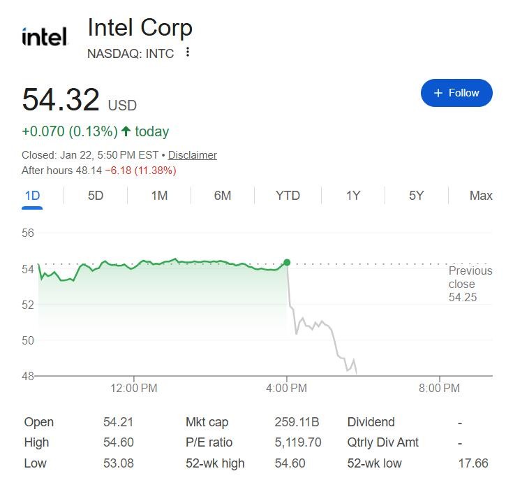 After the company's performance and guidance were announced, Intel's stock price, which had risen 0.1% on Thursday, plummeted after hours, dropping over 4% shortly after the earnings report was released, and continued to decline, with after-hours losses expanding to over 10%.