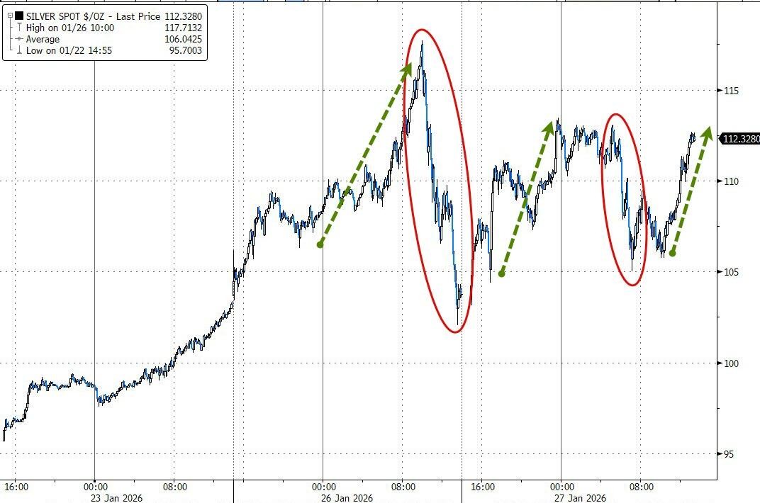 - 連續三個交易日收創新高的紐約期銀回落,COMEX 3 月白銀期貨收跌 8.27%,報 105.957 美元/盎司,週二亞市盤初刷新日低至 102.9 美元,日內跌 10.9%,歐市早盤刷新日高至 113.55 美元時,日內跌幅收窄到 1.7%,美股早盤跌幅曾擴大到 9% 以上,尾盤跌幅收窄到 4% 以內。
