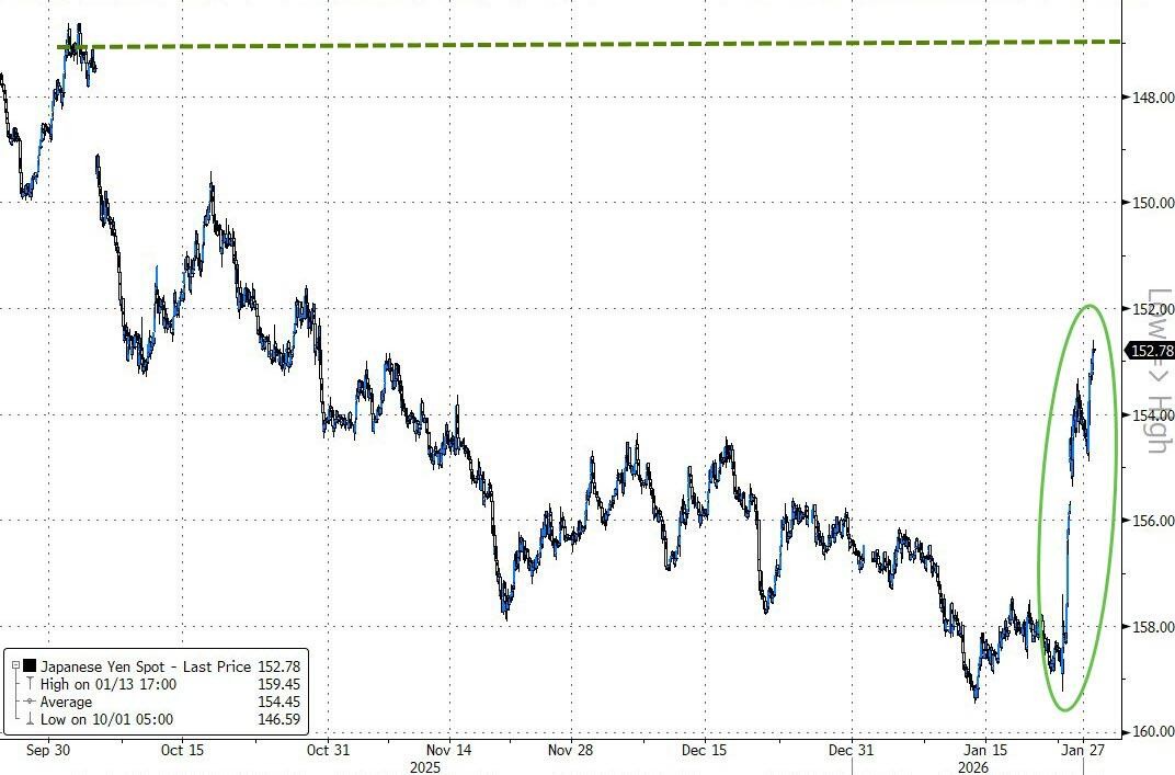 - 日元三連漲,三日累漲略超 4%,美元兑日元在歐股早盤刷新日高至 154.88,歐股盤中轉跌後保持跌勢,美股尾盤跌至 152.10,日內跌超 1.3%,刷新 2025 年 10 月末以來低位。