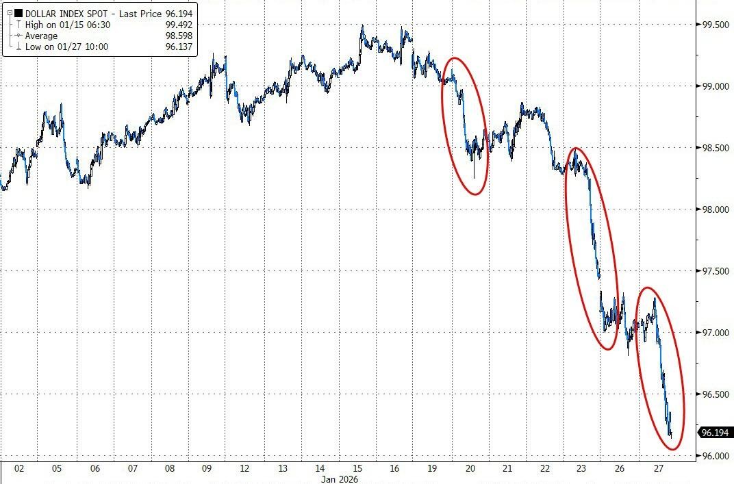 美元指數跌超 1%,創去年 4 月特朗普宣佈關税以來最大四日跌幅;日元三日累漲 4%,歐元和英鎊創 2021 年來新高,離岸人民幣近三年來首次盤中漲破 6.94;比特幣盤中漲超 2% 重上 8.9 萬美元。