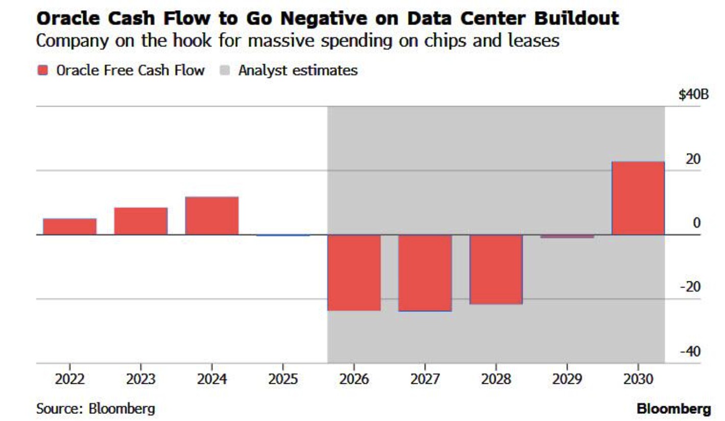 The demand for funds to build AI data centers is outpacing Oracle's cash inflow speed, with the company's free cash flow turning negative, a situation expected to persist until 2030.