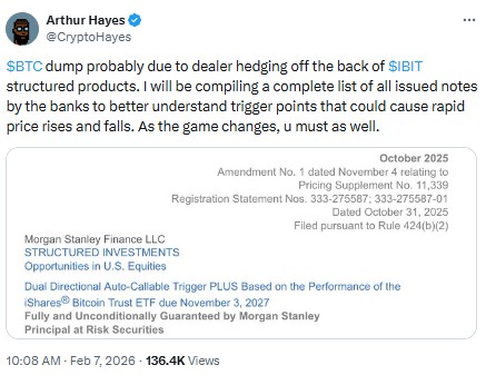 Arthur Hayes, co-founder of BitMex, puts it simply – BTC sold off because banks were hedging positions tied to IBIT ETF. He cited Morgan Stanley’s “structured note” linked to IBIT, basically a bank-made bet on Bitcoin.