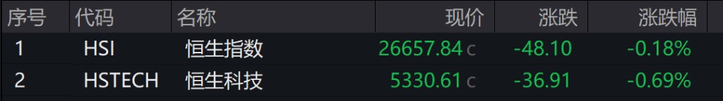 The Hang Seng Index opened down 0.18%, and the Hang Seng TECH Index fell 0.69%. BILIBILI-W dropped nearly 4%, while Alibaba and Baidu both fell around 3%.