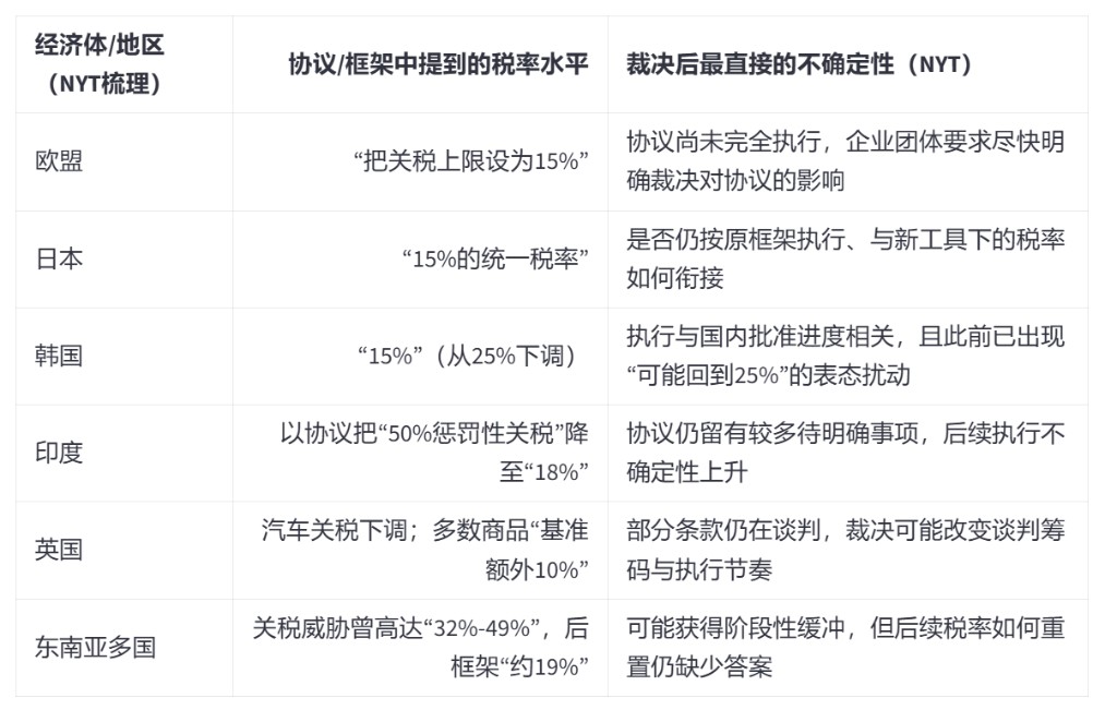 而這一裁決把美國近期與多方達成的一系列貿易協議推進了 “不確定區間”,市場接下來更關心的是:哪些關税層級被撤、哪些仍有效、協議税率是否還站得住。