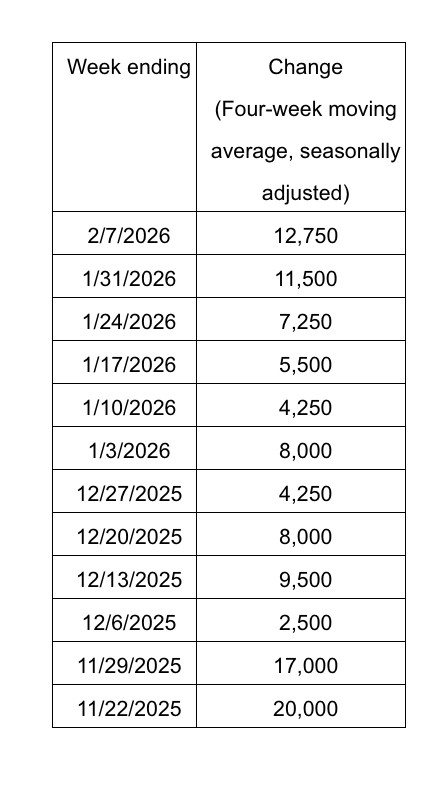 Data shows that the job growth rate has been steadily climbing since the low point in early January: for the week ending January 10, the four-week average was only 4,250; it then gradually rose to 5,500 on January 17, 7,250 on January 24, 11,500 on January 31, and reached 12,750 in the latest report for the week ending February 7, recording month-over-month improvement for four consecutive weeks.
