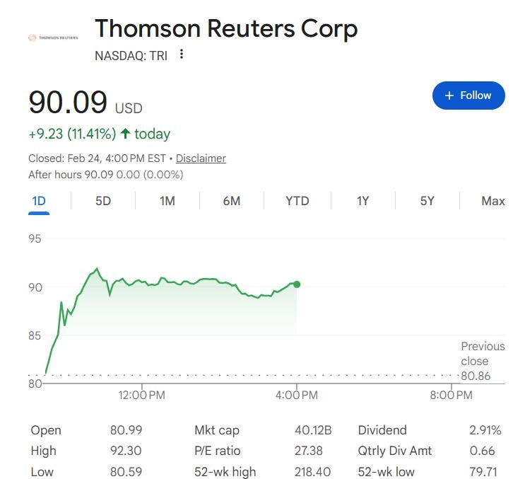到收盤,湯森路透漲 11.4%,FactSet 漲 5.9%,DocuSign 和 LegalZoom 漲約 2.6%。
