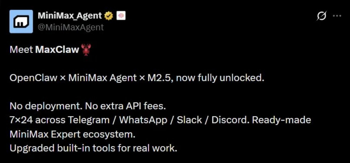 On February 26, Minimax launched the cloud-based AI assistant MaxClaw built on OpenClaw (lobster).