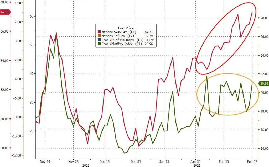儘管 VIX 指數在 2 月份僅僅回到 21 點,但因為套期保值者紛紛湧入市場尋求下行保護,其偏斜度飆升至 2025 年 10 月以來的最高水平。
