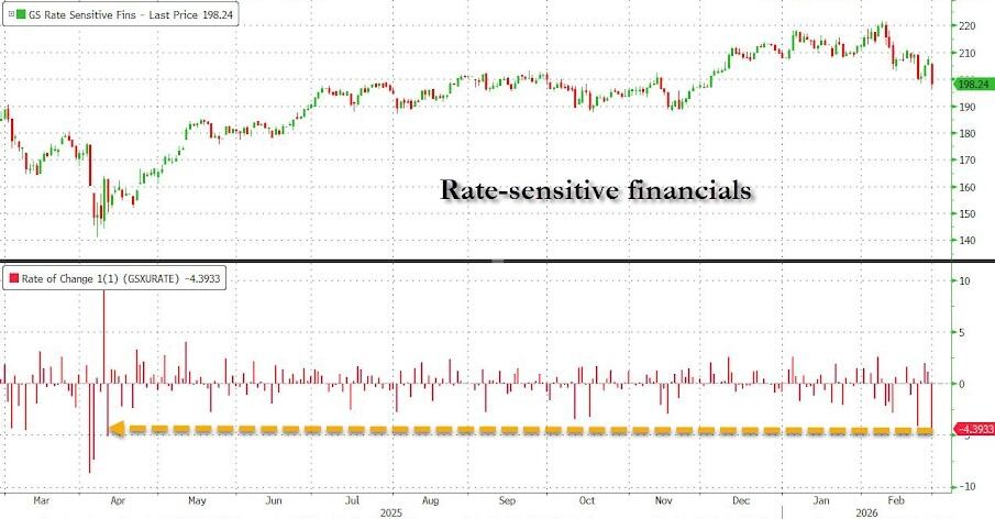 美股金融板塊重挫,標普地區銀行 ETF 暴跌 5%。高盛跌 7.4%,摩根士丹利跌 6.2%,富國銀行和花旗集團跌幅超 5%。對利率敏感的金融股遭遇了去年 4 月以來最大跌幅。