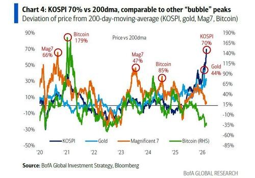美銀 Hartnett 認為,SK 海力士(人工智能內存領域的寵兒)在過去 10 個月裏上漲了 5 倍(再漲 18%,漲幅將與思科在 1998 年 10 月至 2000 年 3 月期間 6 倍的泡沫漲幅持平),這使得 KOSPI 的超買程度與 1 月 26 日的黃金、3 月 24 日的比特幣以及 2023 年 7 月的 Mag7 指數一樣嚴重。所有這些市場在超買之後都出現了大幅回調,而這一次,日經指數(目前處於歷史高位)和人民幣(處於三年高位)也可能面臨同樣的命運。