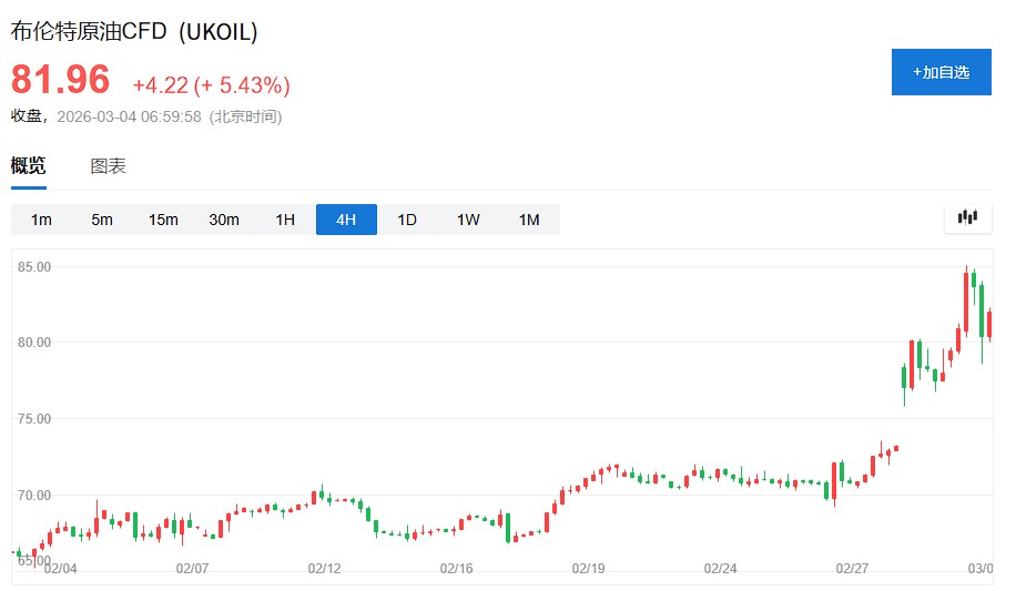 週二,美元走強、黃金重挫、國債收益率全線上行、日元與瑞郎雙雙下跌——傳統避險資產集體"失守"。唯一扮演避風港角色的,是原油。布倫特原油盤中一度飆升逾 8%,成為當日市場最顯眼的贏家,並由此重塑了當天幾乎所有資產的漲跌邏輯。