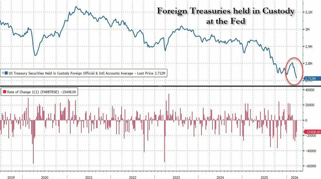 Data from the Federal Reserve Bank of New York's custody accounts shows that foreign monetary authorities have been net sellers of US Treasuries for five consecutive weeks since the week before the conflict began (the week of February 25). The cumulative sell-off has exceeded $90 billion, with selling pressure concentrated in the last three weeks. US Treasury holdings have fallen to their lowest level since 2012.