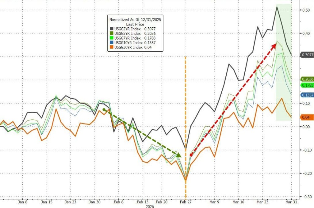週二,10 年期美國國債收益率降至 4.310%,低於上週五創下的 2026 年高點 4.439%。在約 30 萬億美元的國債市場上,資金正從"通脹擔憂"向"增長憂慮"轉移。
