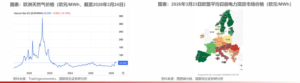 歐洲市場的催化最為直接。美伊衝突導致霍爾木茲海峽封鎖,歐洲基準荷蘭 TTF 天然氣價格在衝突爆發後數週內翻倍,一度突破 60 歐元/MWh。截至 2026 年 3 月 23 日,意大利、奧地利、匈牙利、羅馬尼亞等國平均日前電力現貨價格已超 150 歐元/MWh,德國、英國亦超 140 歐元/MWh。與此同時,英國、波蘭、匈牙利等多國陸續落地户儲補貼,淨計量政策退坡與動態電價普及進一步提升户儲經濟性。