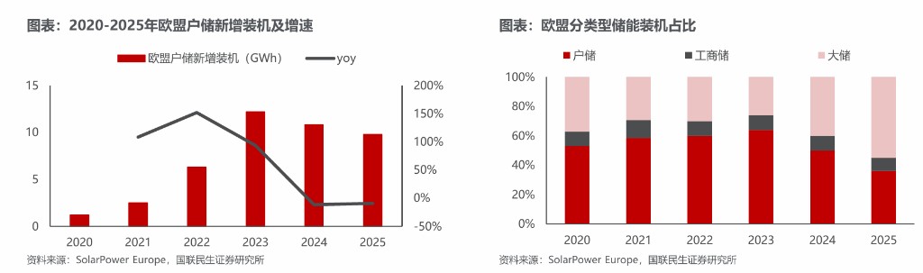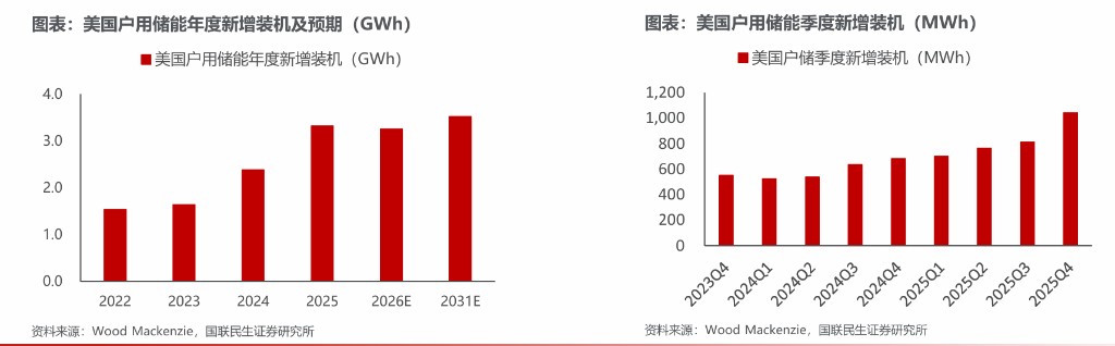 2025 年,"大漂亮"法案取消户用光伏和儲能項目 30% 的税收抵免,催生大規模搶裝需求。據 Wood Mackenzie 數據,2025 年美國户用儲能新增裝機 2.685GW/3.318GWh,功率和容量同比分別增長 92% 和 39%。展望 2026 年,第三方所有權(TPO)模式下的户用系統屬於商業項目,可繼續享受税收抵免,用户通過租賃或購電協議使用系統,或將成為自有光儲系統的替代方案,為政策退出後的市場提供延續性支撐。