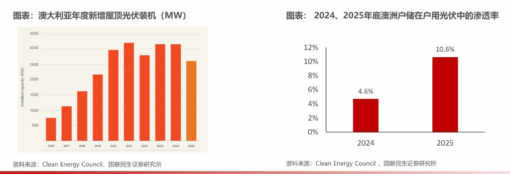 補貼政策激活潛在需求。2025 年 7 月,澳大利亞聯邦政府啓動 23 億澳元"家用電池補貼計劃",對容量 5 至 50kWh 的儲能電池提供最高 372 澳元/kWh 的補貼,大致覆蓋安裝成本的 30%。據澳大利亞清潔能源委員會數據,2025 年下半年新增户儲裝機 18.3 萬套,同比增長 305%,全年新增 26.9 萬套。2025 年 12 月,澳洲政府將補貼預算追加至 72 億澳元,並引入容量分級補貼機制,目標到 2030 年實現 40GWh 的新增儲能容量。國聯民生證券預計,2026 年澳洲户儲需求有望延續高增。