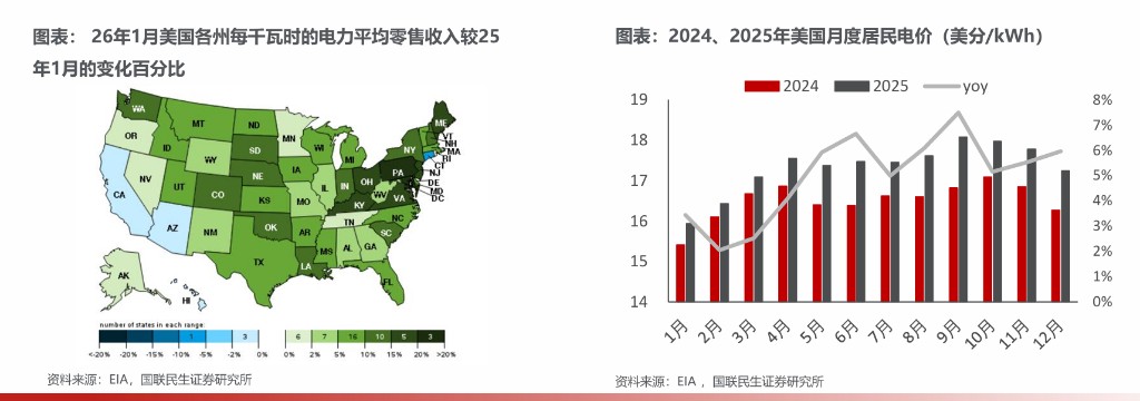 電力短缺是更深層的結構性驅動力。AI 數據中心激增疊加傳統電源退役潮,使電力供需缺口持續擴大。據蘭德公司測算,到 2030 年 AI 數據中心帶來的電力需求預計達 158 至 253GW,而屆時美國前端電網的淨可用容量增量僅約 33GW。供需失衡已在價格端顯現:2025 年全年美國平均居民電價同比上漲 5% 至 17.30 美分/kWh;2026 年 1 月進一步同比上漲 9.5%,弗吉尼亞州和佛羅里達州漲幅分別達 13.8% 和 10.4%。2026 年 2 月,一場強冬季風暴使超過 50 萬用户陷入停電,再次暴露電網脆弱性。