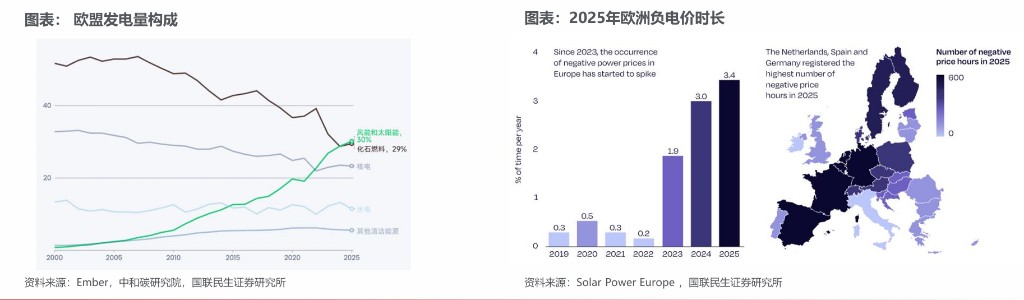 供需格局層面,2025 年歐盟風光發電量佔比已升至 30%,首次超過化石燃料,但風光出力與用電負荷的時間錯配加劇了電網消納壓力。2025 年西班牙、德國、荷蘭的負電價時長均超過 500 小時,比利時、法國、波蘭等超過 450 小時,儲能的平抑作用日益凸顯。