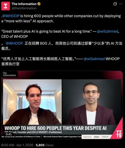 WHOOP's CEO Ahmed stated, "This may be one of the best talent markets in history, with many excellent talents currently unemployed or working in companies that constantly talk about how they will be replaced by AI."