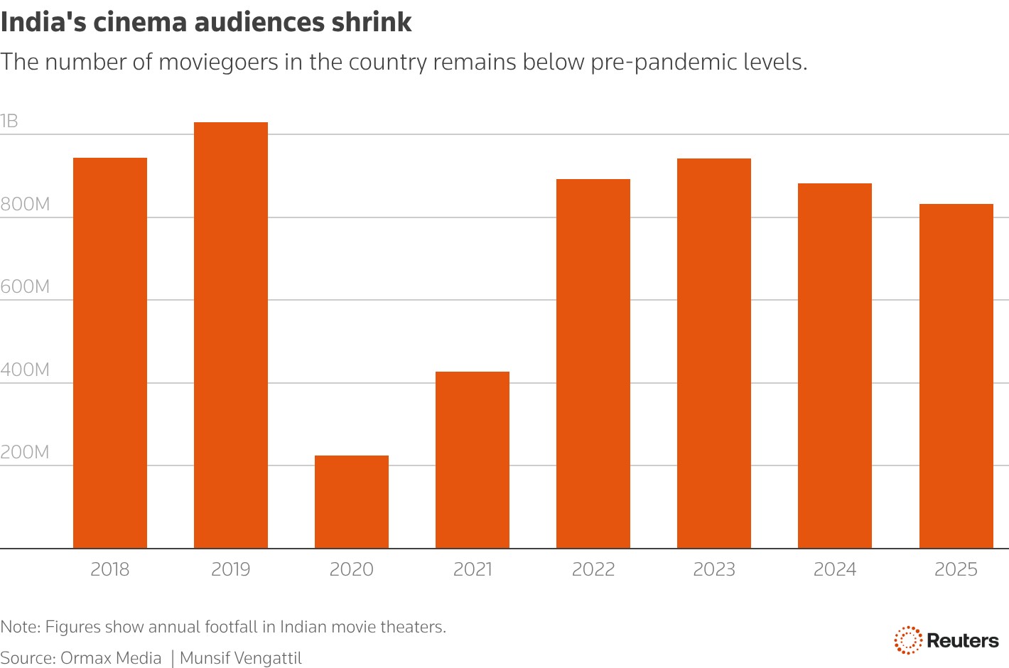 印度是全球年產量最多的電影生產國,諸如沙魯克·汗(Shah Rukh Khan)和阿米塔巴·巴強(Amitabh Bachchan)這樣的明星擁有如同信徒般的粉絲。但製作習慣的轉變,包括流媒體的興起,正在壓縮生產預算,許多業內人士表示。從諮詢公司 Ormax Media 的數據來看,電影觀影者數量從 2019 年的 10.3 億下降至 2025 年的 8.32 億。而雖然去年的票房收入創下了 14 億美元的紀錄,但疫情以來的收入起伏不定,完全依賴於少量票房佳作和更高價位的票。