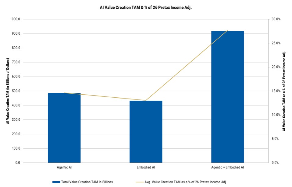 Among these, agentic AI (software level) and embodied AI (physical level represented by robots) contribute nearly half of the value each;