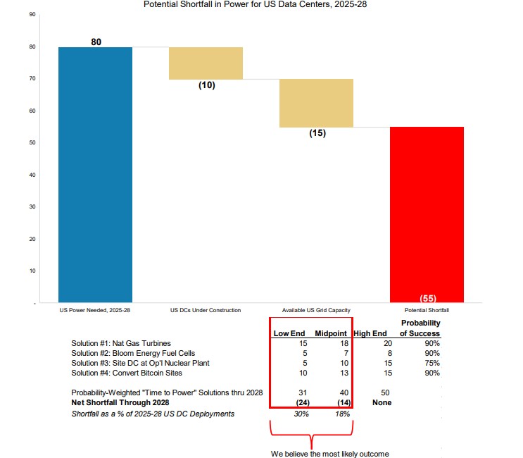 - Converting Bitcoin mining sites into data centers: Can alleviate a 10–15 GW gap, with a 90% probability of success.