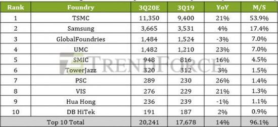 在需求激增的刺激下,其他代工廠也在投資大筆資金。總部位於台灣的全球最大晶圓代工廠台積電擁有近 54% 的市場份額。該公司本週四表示,計劃在未來三年內投資 1000 億美元,以提高產能滿足市場需求。