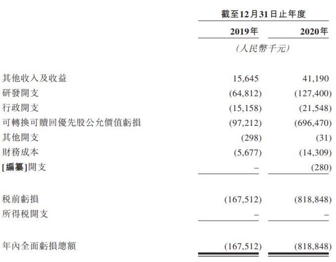 招股书显示,康诺亚生物的产品尚未获准进行商业销售,因此尚未从产品销售中产生任何收入。自公司成立以来,公司每年产生经营亏损。于 2019 年及 2020 年,公司分别产生全面亏损总额 1.68 亿元及 8.19 亿元。全面亏损总额主要来源于研发开支、行政开支及可转换可赎回优先股公允价值亏损。