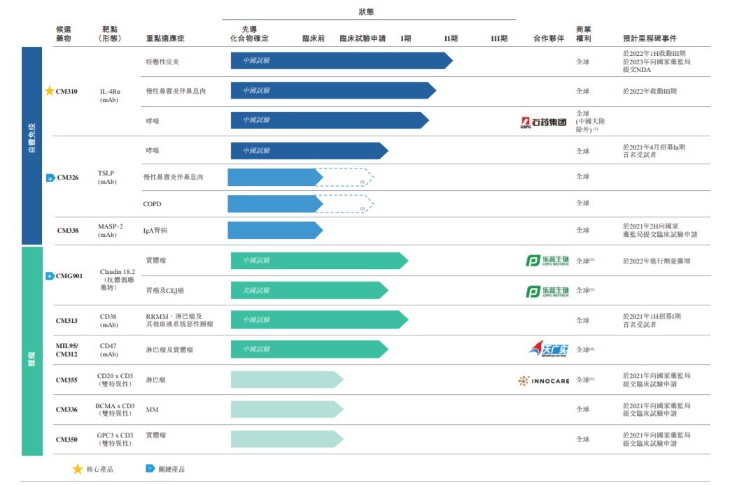 公司的主要候选药物包括 CM326(TSLP 抗体) 和 CMG901(Claudin 18.2 抗体偶联药物)。其中,CM326 是针对胸腺基质淋巴细胞生成素 (TSLP) 的人源化高效单克隆抗体。其为中国首个全世界第三个获临床试验申请批准的国产 TSLP 靶向抗体。CMG901 是靶向 Claudin 18.2 的抗体偶联药物,含 Claudin 18.2 特异性抗体、可裂解连接子及毒性载荷单甲基澳瑞他汀 E (MMAE)。其为首个在中国及美国取得临床试验申请的 Claudin 18.2 抗体偶联药物。