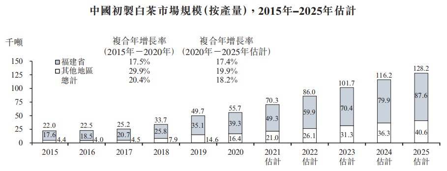 據灼識諮詢顯示,自 2015 年至 2020 年,中國初制白茶產量由 22.0 千噸增至 55.7 千噸,複合年增長率為 20.4%。白茶多產自福建省,而由於白茶市場近年來大漲,白茶產區已逐漸擴展至湖北省、貴州省、浙江省及山東省等地。受白茶消費市場擴大及農業技術提高所推動,預期初制白茶產量將持續增加並於 2025 年達 128.2 千噸。