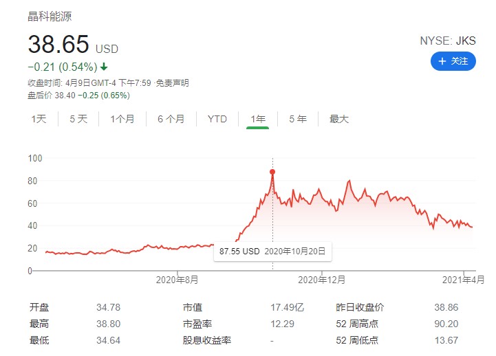 晶科此前股價多年低迷,去年 9 月下旬股價突然爆發,1 個月時間漲了三倍,隨後逐步下跌。目前,該公司股價已經腰斬。