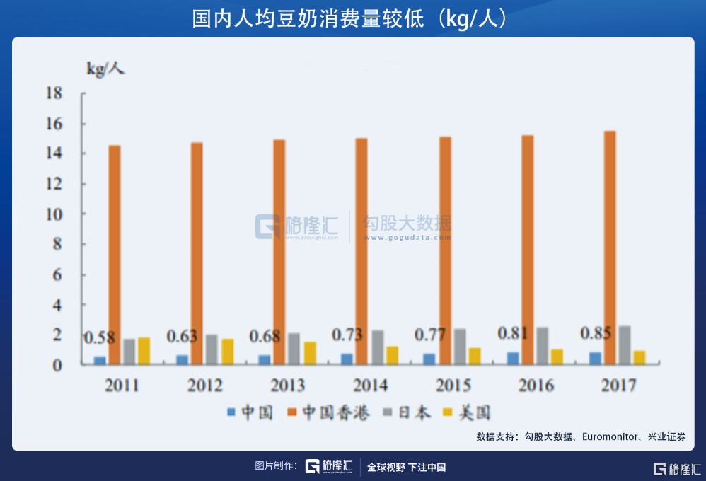 豆奶作為豆漿的替代品,在我國的市場潛力巨大。根據 Euromonitor 統計,2017 年我國人均豆奶消費量僅為 0.85KG,香港人均消費量為 15.56KG,不跟香港比,與我們飲食習慣相近的日本,豆奶的消費量也是我們的 6 倍,這裏可見我國的市場潛力。對標日本,國內潛在市場空間在 1000 億左右。