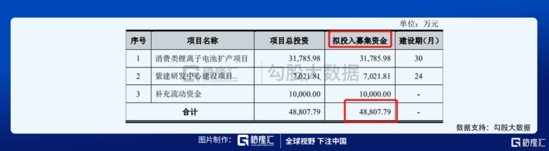 招股書披露,紫建電子本次 IPO 擬募資 4.88 億元。其中,3.88 億元用於項目建設。