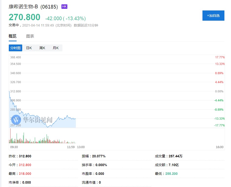 今日港股早盤,康希諾生物急速下挫,截至午盤收盤,跌超 13%。
