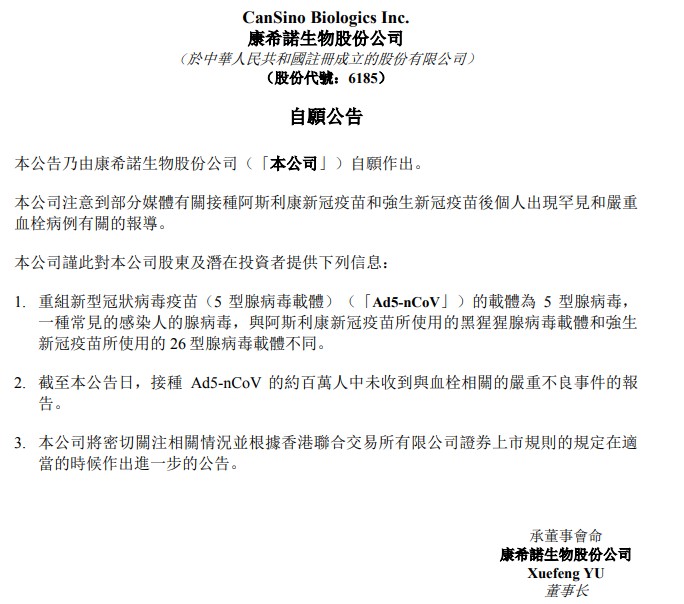康希諾表示,注意到部分媒體有關接種阿斯利康新冠疫苗和強生新冠疫苗後個人出現罕見和嚴重血栓病例有關的報導。該公司與阿斯利康新冠疫苗所使用的黑猩猩腺病毒載體和強生新冠疫苗所使用的 26 型腺病毒載體不同。截至本公告日,接種重組新型冠狀病毒疫苗 Ad5-nCoV 的約百萬人中未收到與血栓相關的嚴重不良事件的報告。