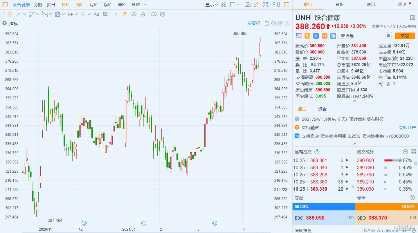 聯合健康(UNH.US)今日股價走高,盤中一度漲超 4%,股價高見 390.89 美元創歷史新高;現漲幅為 3.36%,報 388.26 美元。