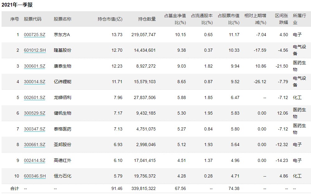 具體到重倉股持倉來看,通威股份、吉宏股份退出前十大重倉股,而龍蟒佰利、恆力石化則新入前十大重倉股。