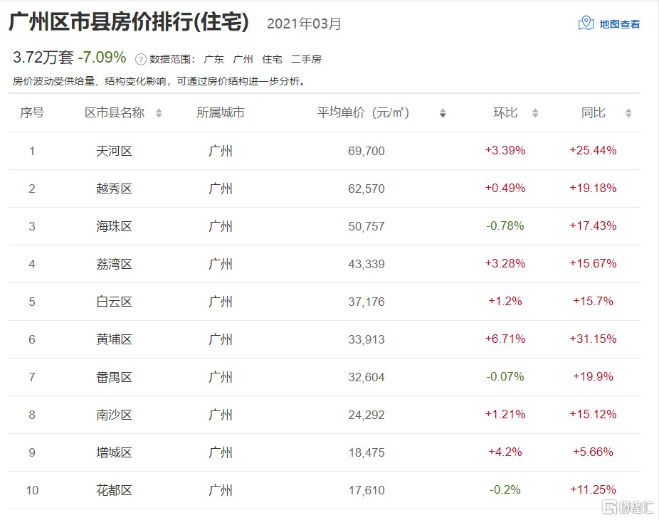 根據中國房價行情網數據顯示,均價前十的區,除了番禺、海珠、花都,其餘區域,3 月二手房價環比都略有上漲。