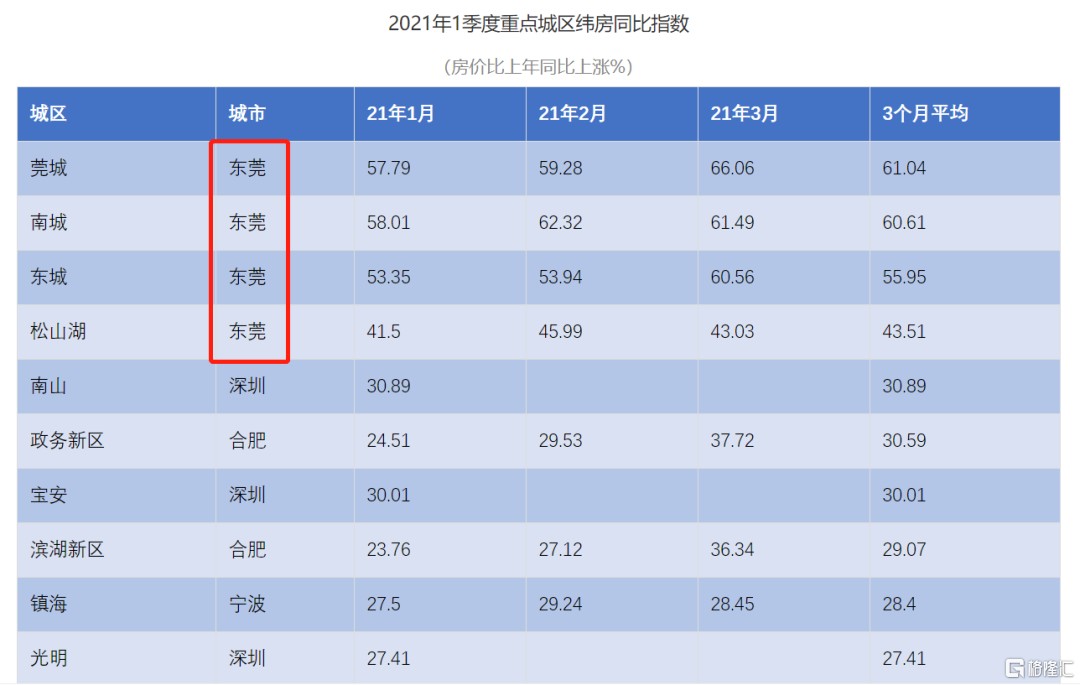 根據 2021 年 1 季度重點城區緯房同比指數,從全國數據可以看到,前十名當中東莞佔了前四名,並且指數比深圳各城區高出不少。