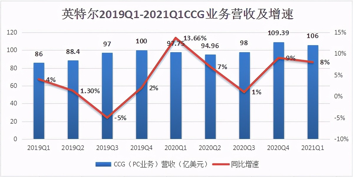 英特爾的 CCG 業務即包括個人電腦(PC)芯片在內的英特爾客户端計算事業部,一季度營業收入 106.1 億美元,同比增長 8%,高於市場預期的 100 億美元。