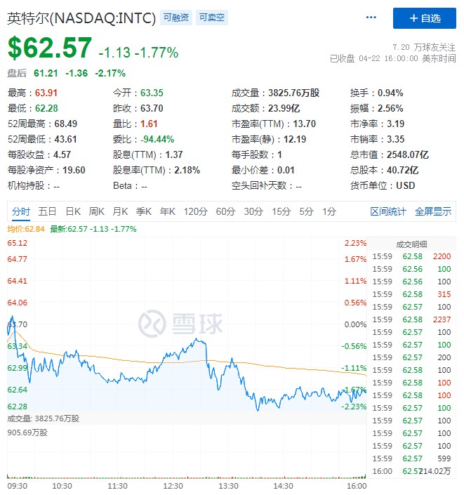 截至目前,英特爾盤後股價為 61.21 億美元,盤後下跌 2.17%,市值為 2548.07 億美元。
