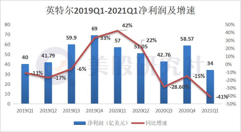 利潤方面,從 2020Q1 開始,英特爾的淨利潤持續下滑,僅 2020Q4 利潤上升,但對比 2019 年同期依然下降 15%。本季度淨利潤僅 34 億美元,同比下降 41%。
