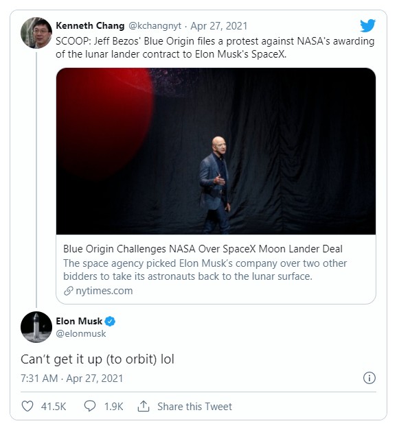 因為爭奪登月合約,馬斯克在社交媒體上辛辣嘲諷貝佐斯的火箭公司:誰讓你起不來?