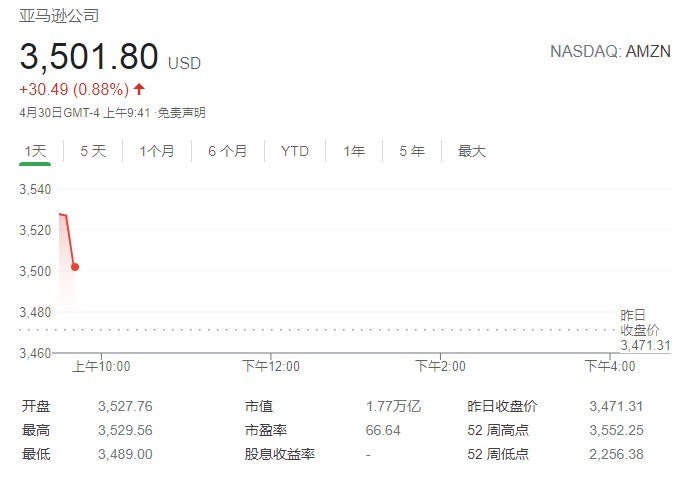 亞馬遜漲超 1%。週四盤後財報數據顯示,亞馬遜一季度營收大增 44% 至史上第二高,連續兩季超 1000 億美元,EPS 是去年同期三倍,下季指引意外強勁,AWS 雲業務收入和運營利潤均增超 30%,且年銷售額 540 億美元。