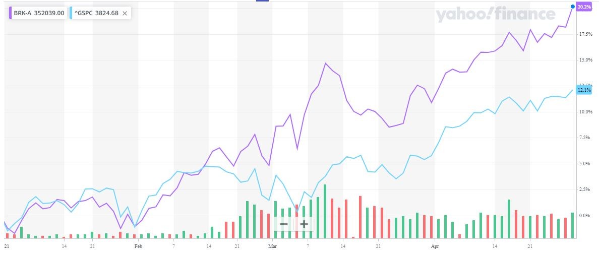 不过,公司 A 类股在 4 月 29 日本周四创下近 41.80 万美元的收盘历史新高,今年累涨 19%,跑赢标普 500 大盘同期逾 11% 的涨幅。伯克希尔 A 类股已较去年 3 月 23 日的低点大幅反弹 52%,相对便宜的 B 类股过去 12 个月也涨超 47%。