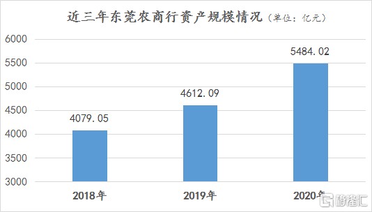 上市申請書顯示:截至 2020 年 12 月 31 日,東莞農商行的資產總額達到了 5484.02 億元,相比於上年末淨增加 871.93 億元,同比增長 18.91%,相比於 2018 年末增加累計增加 1404.97 億元,累計增長 33.44%。