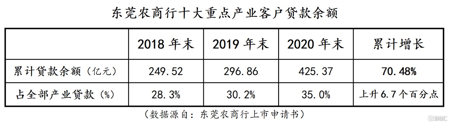 上市申請書顯示:截至 2020 年 12 月 31 日,東莞農商行的十大重點產業客户數為 12.58 萬户,相比於前兩年沒有太明顯的變動,但十大重點產業貸款餘額則從 2018 年的 249.52 億元迅速攀升至 2020 年的 425.37 億元,累計增幅達 70.48%。